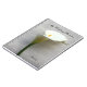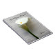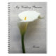 Um lindo lírio branco com um histórico de roteiro antigo em um caderno espiral para ajudar a organizar seus detalhes do casamento.