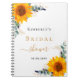 Uma cor branca de fundo. Decorado com girassóis, eucalipto verde e folhagem de ouro. Adicionar um nome e uma data.