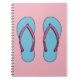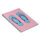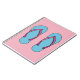 Uma ilustração de um par de chinelos de praia cor-de-rosa e azuis. É verão! O vamos faz uma pausa e diverte-te debaixo do sol. Você não está animado em preparar suas coisas para as férias? Não esqueça seus chinelos.