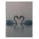 Foto incrível de dois cisnes nadando cabeça a cabeça criando a ilusão de um coração na água. Eles estão juntos num lago neblina de manhã cedo,