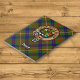 Crachá da crista Clan Fraser cercado por uma correia e fivela sobre a caça ao fundo do tartan. Texto personalizado.