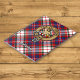 Crachá da crista Clan MacFarlane rodeado por uma correia e fivela sobre o fundo do tartan vestido. Custom Text.