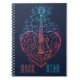 Este design de notebook celebra o amor da música e do violão. Ele tem uma ilustração simplista de um violão eletrônico rodeado por um grande coração de neon e notas musicais.