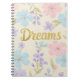 This whimsical floral pattern features a delicate pastel color palette, creating a soft and dreamy aesthetic. The design showcases an enchanting arrangement of pastel flowers and foliage, perfect for adding a touch of feminine charm and romantic elegance. The cover is beautifully adorned with a shiny gold foil inscription of the word "Dreams," adding a luxurious and inspiring element. This design is ideal for those seeking a pretty floral design with a touch of gold, evoking feelings of serenity and inspiration.