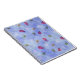Um padrão giro. Damascos vermelhos com manchas pretas, folhas verdes e amarelas flutuando ao redor, margaridas rosa giras, e borboletas lavandas constituem este delicado e delicado padrão em um fundo roxo azulado.