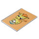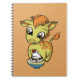 Um girafa amarelo e alaranjado colorido que sorri feliz para baixo em uma separação de banana em uma bacia azul.