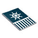 Design náutico com roda de vela e decoração de listras azuis e brancas sobre fundo azul