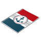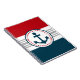 Design náutico com decoração em forma redonda com âncora sobre fundo azul, vermelho, cinza e branco listrado