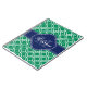 Padrão de latência marroquina esmeralda verde e branca com um marinho inicial de monograma. Por cima do padrão verde e branco da lista, há um rótulo marinho azul e branco que contém uma letra monográfica e um modelo de nome para personalizar.
