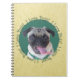 Adorável notebook com uma foto de um cachorro com sua língua longa saindo com a legenda "I Love Pugs!"