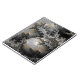 Um objeto esférico com uma superfície refletora se senta de forma destacada entre padrões complexos e fractais com vários tons de cinza, preto e ouro. Os intrincados padrões aparecem quase como uma paisagem texturizada, enquanto a esfera age como uma lente distorcendo e comprimindo os detalhes ao redor.