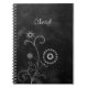 Um notebook branco e preto de estilo boêmico com desenho de giz floral branco de um dente-de-leão e outras flores silvestres com espirais de flecha contra um fundo preto de ardósia. Personalize este bonito design de quadro-negro adicionando seu nome.