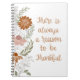 O notebook apresenta flores e folhas desenhadas à mão, acrescentando um toque da beleza da natureza com uma mensagem manuscrita que diz: "Há sempre uma razão para ser grato", transmitindo uma mensagem de gratidão e positividade.