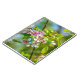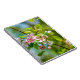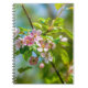 Vista aproximada de flores de maçã rosa e folhas verdes. A altura da primavera, árvores frutas em cheio floresce. Fotografia texturizada, cores alegres.