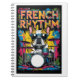 Funny drawing of a French Bulldog playing drums, streetwear style