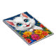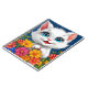 Gato de desenho animado adorável com pelo branco liso e olhos azuis grandes e expressivos. O gato está se destacando de um vibrante buquê de flores coloridas, incluindo o florescimento laranja, rosa, amarelo e azul. Seu nariz rosa pequeno e sorriso alegre somam seu charme, criando uma atmosfera lúdica e convidativa. O fundo é azul profundo, aumentando o brilho das flores e das características do gato, fazer a cena geral se sentir viva e alegre.