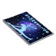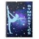 Galaxy Gymnastics design com estrelas brancas, forma leitosa, silhueta de ginástica feminina azul de pó claro e diz ginástica em forma vertical.