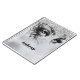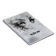 Este design de notebook de vidro apresenta um fundo brilhante de prata com tipografia preta personalizada e olhos brilhantes. Perfeito para profissionais de moda ou beleza.