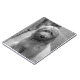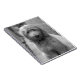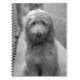 Um filhote de Goldendoodle adorável e peluda sentado em um jardim de concreto caminhando ao longo de uma parede de tijolos em preto e branco.