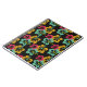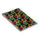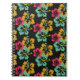 Design tropical de Hibiscus com flores coloridas contra fundo preto.