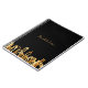 Um fundo preto, com um horizonte de cidade dourado falso como decoração. Modelo para o seu nome com letras douradas. O nome é escrito com um estilo de letra manuscrita moderno e atual.