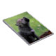 Fotografia de um adorável filhote de lobo negro uivando na grama.