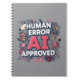 This energetic digital illustration features the bold phrase "HUMAN ERROR AI APPROVED" surrounded by abstract technological elements and a friendly cartoon robot. Coral-red, white, and gray tones create a dynamic, modern look. Perfect for AI enthusiasts, tech lovers, and digital art collectors, this vibrant design combines humor, innovation, and playful robotics in a striking composition.