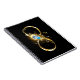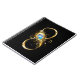Símbolo Dourado e brilhante do infinito, decorado com pena de joalharia de pavão com turquesa sobre fundo preto.