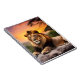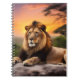 Belo Leão deitado numa rocha com o pôr do sol da selva atrás