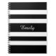 Notebook de ligação espiral com um padrão listrado preto e branco e impressão de nome personalizado branco no lado frontal.