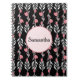 Com lindas cores dramáticas, este caderno é uma obra de arte. Apresentando uma bela vinha rosa-rosa e branca em preto como fundo, há um gráfico circular cor-de-rosa no meio, perfeito para adicionar seu nome. Faça seu pedido hoje mesmo! Trabalho de arte floral em segundo plano: AMBilustrações http://www.etsy.com/shop/AMBillustrations/