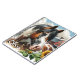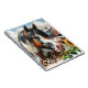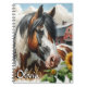 Lindo caderno personalizado com um cavalo marrom, preto e branco manchado, cercado por girassóis e um celeiro vermelho rústico ao fundo.