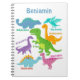 Um caderno de dinossauros colorido e adorável com dinossauros de desenho animado fofos e seus nomes em uma fonte divertida e brilhante. Dinossauros - Tyrannosaurus Rex (T-Rex), Pteranodon, Brontossauro, Anquilossauro, Plesiossauro, Velociraptor e um Estegossauro. Este caderno é um ótimo presente personalizado de volta às aulas, aniversário ou Natal para um jovem fã de dinossauros pré-históricos! Personalize com a sua escolha de nome.