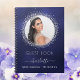 Um guia para uma Quinceañera feminina e glamourosa, 15 (ou qualquer idade) festa de aniversário. Um fundo azul na moda marinho com brilho falso prateado brilha ao redor da foto. A cor azul é irregular. Adicione seu nome, idade, data e uma foto.
