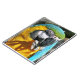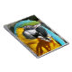Um design fotográfico de uma arara azul e dourada muito fofa.
