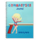 Este caderno de menina de ginástica fofa apresenta uma linda menina loira de ginástica em pé na frente de uma trave. Ela está usando um collant vermelho e sorrindo acima de seu nome personalizado azul bonito.