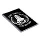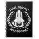Lançamento do ônibus espacial com texto "Longe e além!" Gráfico e design de texto inspiracional em notebook espiral para amantes e exploradores de espaço.
