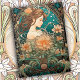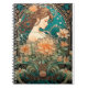 Este caderno Art Nouveau apresenta uma mulher elegante na capa, rodeada por uma moldura ornamentada e belas flores suaves.