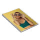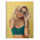 Caderno Espiral Mulher em bralette azul segurando óculos de sol co