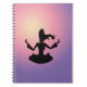 A moda e a silhueta refrescante de uma mulher a meditar num fundo roxo a amarelo.