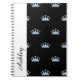 Notebook mostrado com um impressão de arte de uma coroa colorida azul prateada sobre fundo preto e um nome personalizado. Notebook mostrado em um design preto e branco. Personalize este item e mude o nome para o seu ou retire o nome e o comprar como está.
