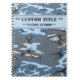 Notebook com padrão de camuflagem em azul e cinzas com título e bloco de autor editável. Personalize na página do produto com o texto, os números ou os símbolos de texto de sua escolha.