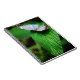 Uma fotografia de uma borboleta Morpho Azul numa folha num jardim.