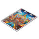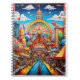 cena vibrante e colorida do parque de diversões. No centro, há uma grande roda-gigante com a palavra "SKYLANE" nela. Ao redor da roda-gigante estão várias estruturas brancas, incluindo torres e tendas com bandeiras. O céu está cheio de balões de ar quente e nuvens fofinhas. Uma multidão arrepiante de visitantes é vista nos caminhos, aproveitando o ambiente festivo. O ambiente é um ambiente de entusiasmo e diversão, típico de um campo de feira ou de um parque temático.