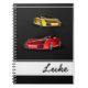 O notebook fotográfico é mostrado com um fundo preto e com um impressão de carro desportivo rápido de rico. Nome personalizado, personalize este item e altere o nome para o seu ou até remova o nome se desejar e adicione outro texto.