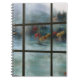 Uma paisagem fria de outono vista através de uma janela de foscos no início de uma manhã. Pinheiros e pinheiros com gelo clareando suas agulhas, mapeamentos em tons de vermelho, laranja e amarelo, grama polida vista através da ascensão de nevoeiro de um riacho escondido. Flanqueando a janela de ambos os lados estão folhas de rosa vermelho e verde.