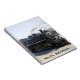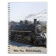 Notebook com um trem antiquado viajando pelo White Pass até Skagway, na Colúmbia Britânica e uma montanha coberta de neve no fundo.