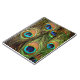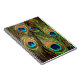 Um notebook fotográfico de penas de pavão com uma fotografia de algumas belas penas de pavão.