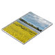 Um campo de canola amarela vibrante floresce sob um céu dinâmico, com manchas de nuvens fluffy lançando sombras na paisagem. Ao fundo, uma banda contrastante de árvores verdes escuras separa o campo de uma extensão tranquila de água. Esta imagem foi tirada perto de Streatham em Victoria, Austrália.