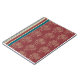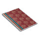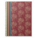 Um notebook espiral elegante, com um padrão floral formalizado e listras em preto e bege e azul escuro sobre um rico fundo burgundy. Faria um excelente diário!